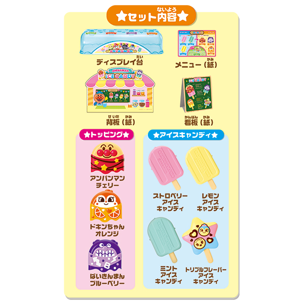 ディスプレイ台、メニュー(紙)、背板(紙)、看板(紙)、トッピング3種(アンパンマンチェリー、ドキンちゃんオレンジ、ばいきんまんブルーベリー)、アイスキャンディ4種(ストロベリーアイスキャンディ、レモンアイスキャンディ、ミントアイスキャンディ、トリプルフレーバーアイスキャンディ)