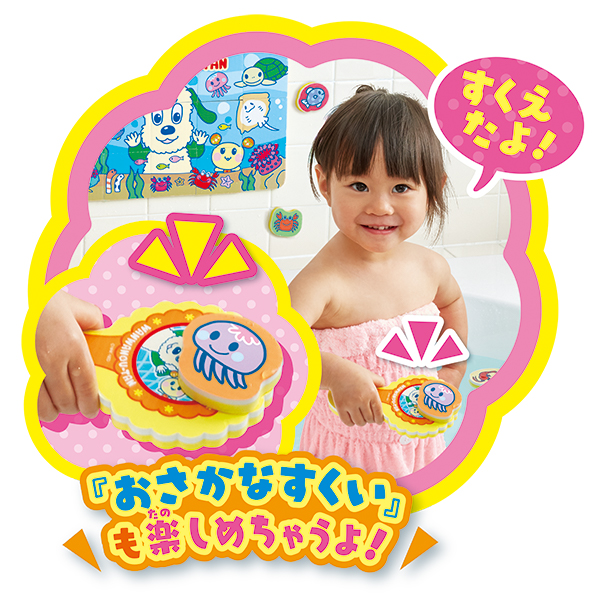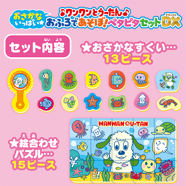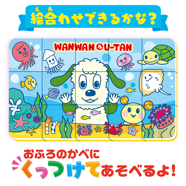 大きな絵合わせパズルと、湯船に浮かべて楽しめる「おさかなすくい」のセットです。水族館にやってきたワンワンとうーたん♪いろんないきものがい〜っぱい!