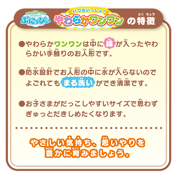 ぷにぷに柔らかい抱き心地のお人形です。お人形の中に綿が入っていてぷにっと柔らかい手触りでお子様が思わずぎゅっと抱きしめたくなります。