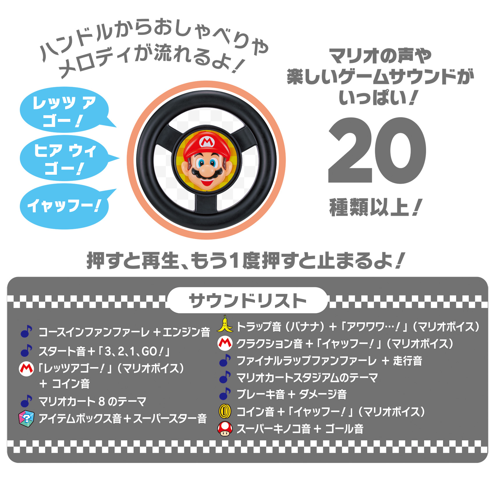 マリオのボタンが付いたハンドルは、押すごとに、コースインファンファーレやエンジン音、「レッツアゴー!」などマリオのおしゃべり、アイテムボックス音やスーパースター音、スタジアムのテーマ曲など、マリオカートのゲームサウンドがたっぷり20種以上楽しめます!