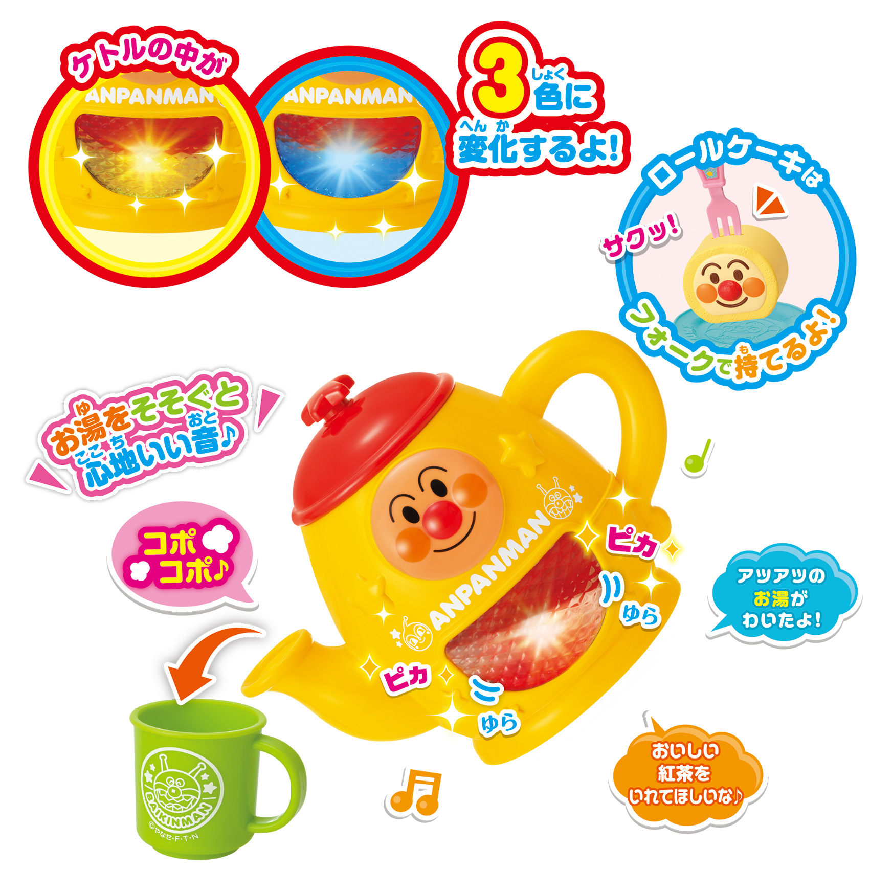 電気ケトル本体、コップ、フォーク、アンパンマンロールケーキ、お皿、ミルクココア(紙製)、紅茶(紙製)