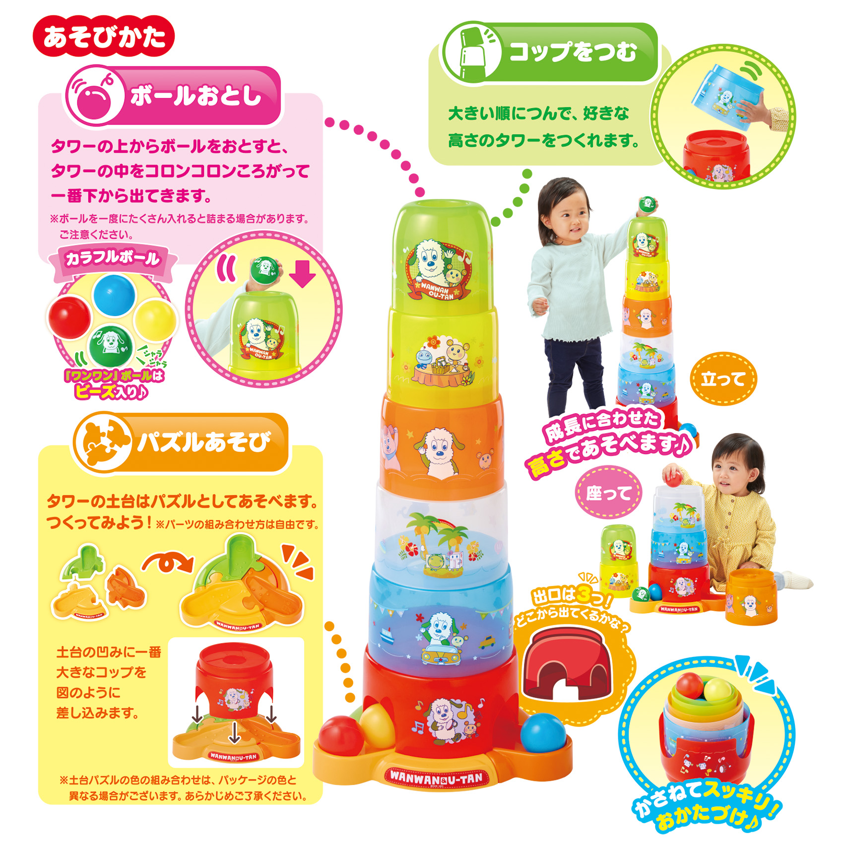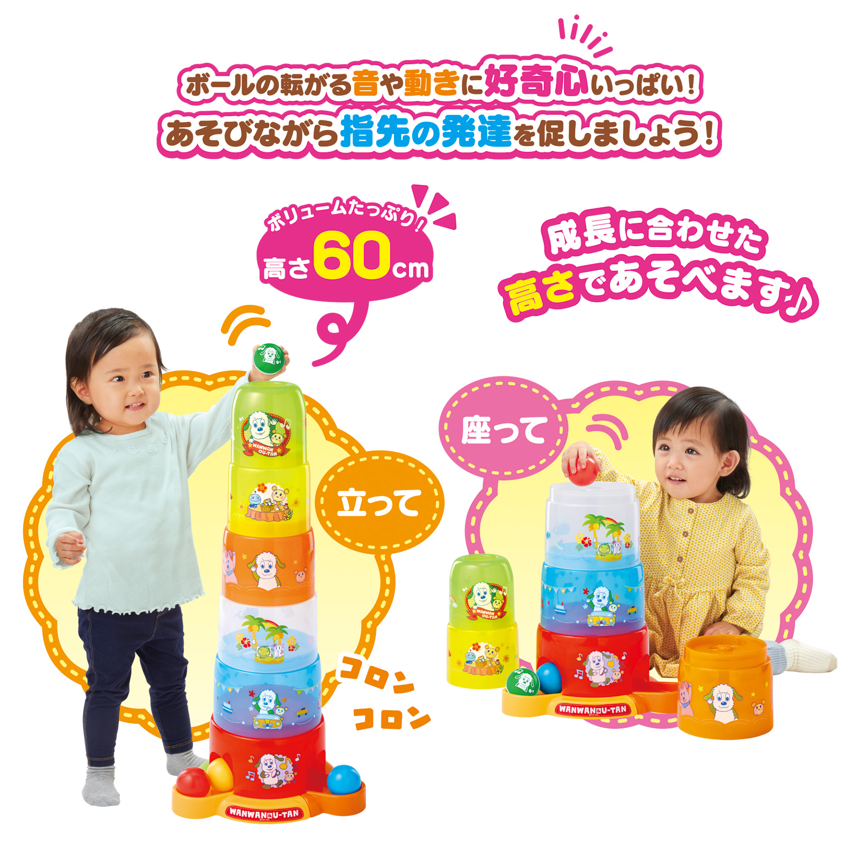 積んだタワーの上からボールを落とすと、タワーの中をコロンコロン転がって一番下から出てきます。
