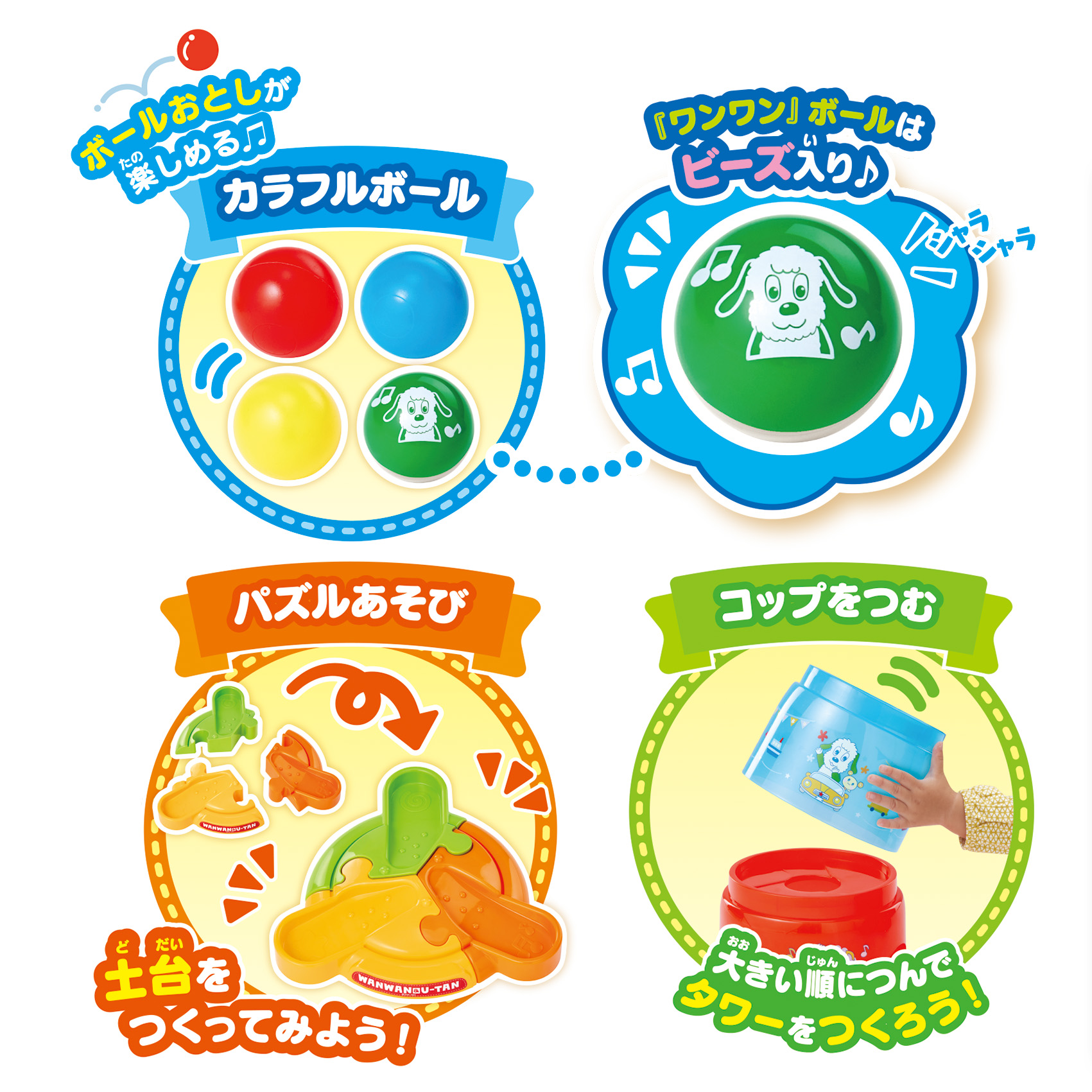 コップ×6個、土台パズル×3個、ボール×4個(『ワンワン』ボール(ビーズ入り)、青、黄、赤)