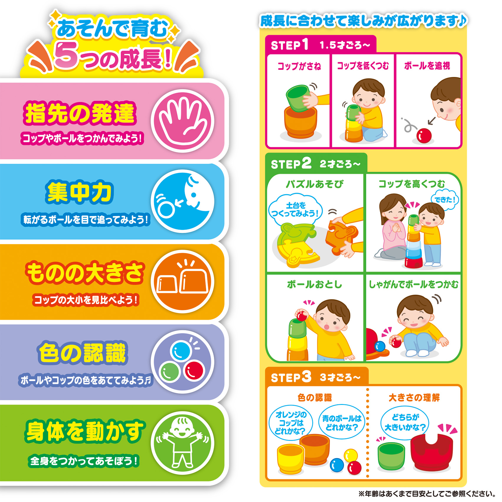 コップはどっちが大きいかな?青のボールはどれかな?と大きさや色の違いを、親御さんとコミュニケーションをとりながら育んでみてください!