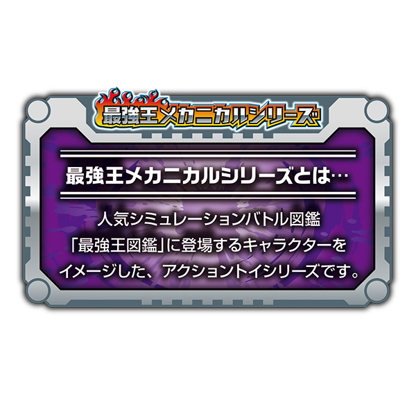 【最強王メカニカルシリーズとは・・・】 人気シミュレーションバトル図鑑「最強王図鑑」に登場するキャラクターをイメージした、アクショントイシリーズです。