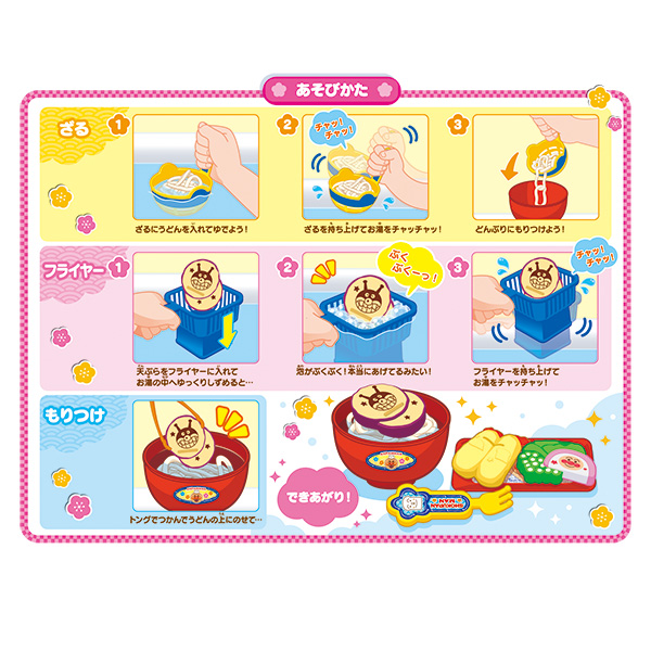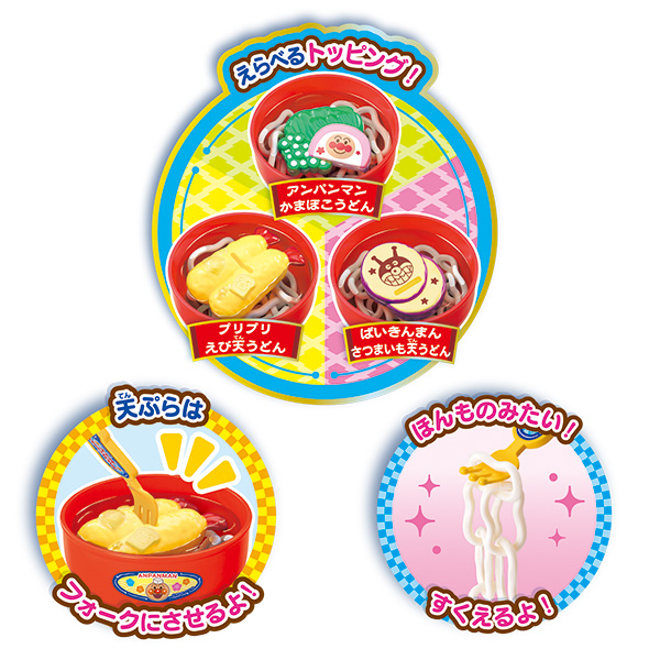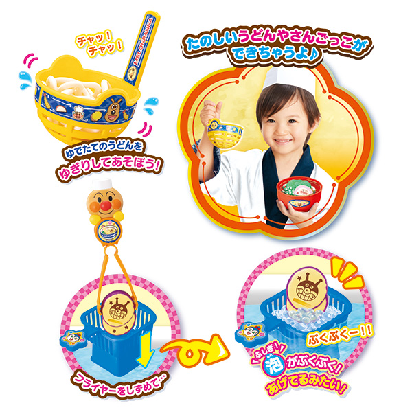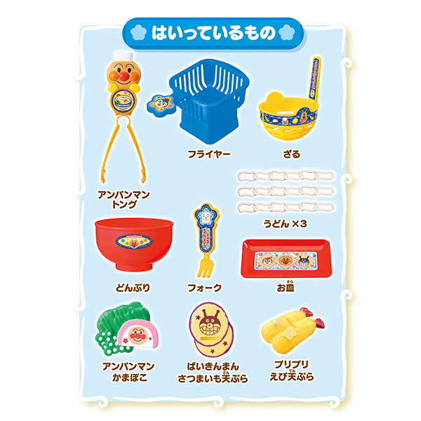 アンパンマントング、フライヤー、ざる、どんぶり、うどん×3本、フォーク、お皿、アンパンマンかまぼこ、ばいきんまんさつまいも天ぷら、プリプリえび天ぷら