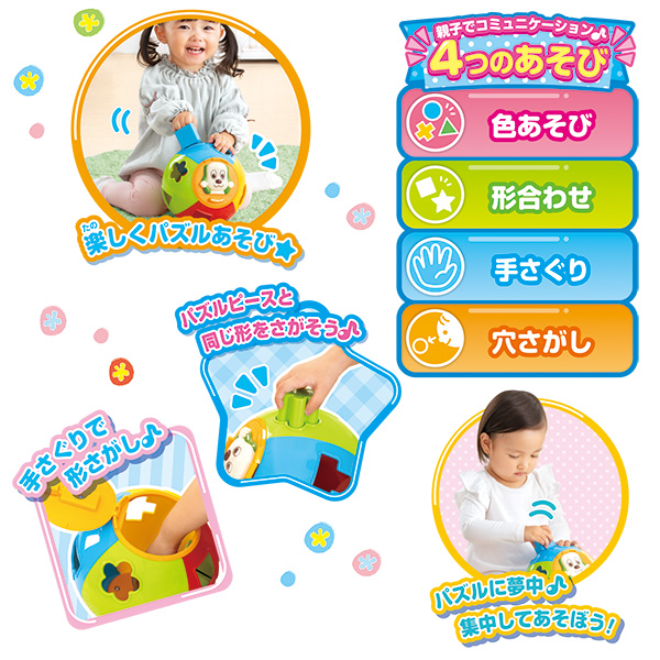 色遊びや形合わせなど、1人でも、親子でコミュニケーションをとりながらも楽しめるパズルトイです。