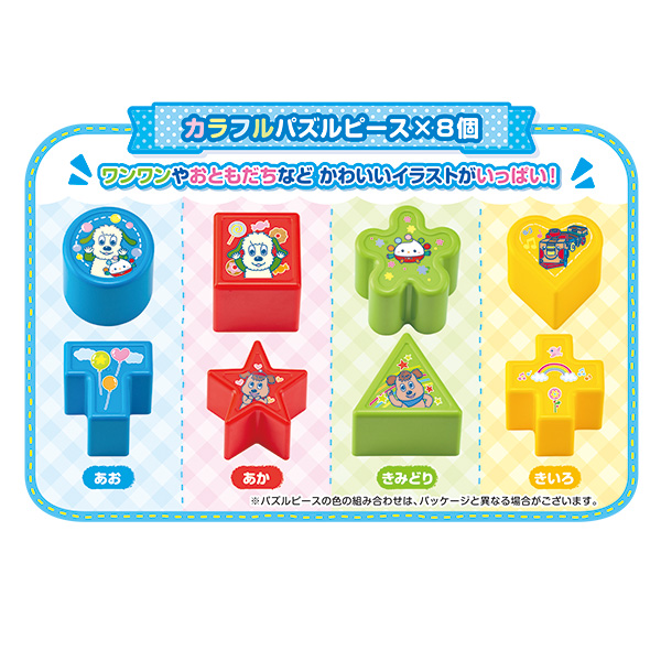 『ワンワン』やおともだちなど可愛いイラストがついたカラフルなパズルピースは8個入っています。