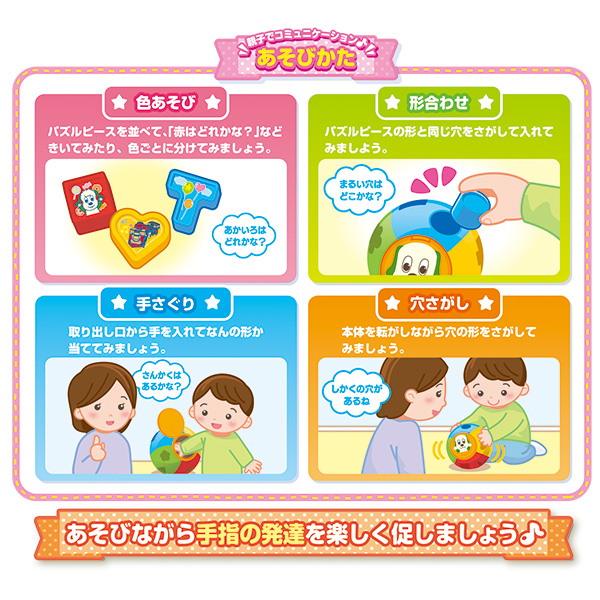 パズルピースを並べて「赤はどれかな?」と聞いたり、「四角い穴はどこかな?」とパズルピースの形と同じ穴を探すことを促したり、コミュニケーションをとりながら遊べます。