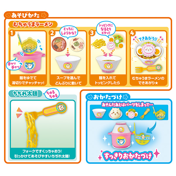 なべ、どんぶり、湯切り、おさら、なると、トッピング(たまご、野菜)、中華まん、フォーク、麺3本、紙製スープ2種(しょうゆ、とんこつ)、シール