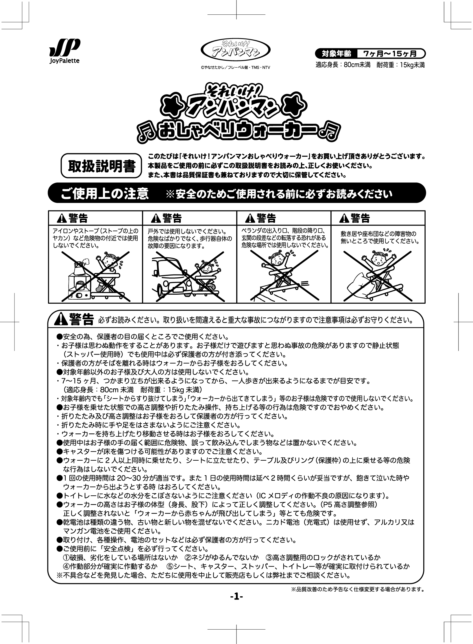 対象年齢は7ヶ月~15ヶ月、適応身長は80cm未満、耐荷重15kg未満、つかまり立ちが出来るようになってから、1人歩きが出来るようになるまでが目安です。