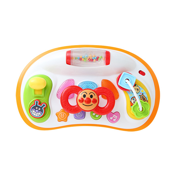 アンパンマンのレリーフが可愛いハンドル、くるくる何度も回したくなるラトル、前後に動かすシフトレバー、ばいきんまんダイヤル、リングトイ、おしゃべりボタンとメロディボタン。