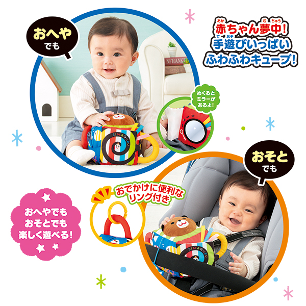 ツルツルやふわふわした部分を触ったり、タグをつまんだり、マスコットを隠したり、めくるとミラーが現れたり、本体を転がすと鈴がリンリン鳴ったり、赤ちゃんを飽きさせない楽しいしかけがいっぱい!