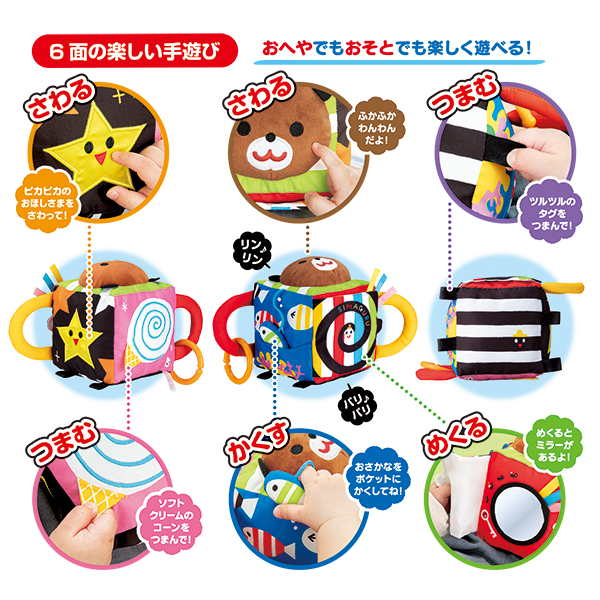 赤ちゃんが夢中になる手の遊びがたくさんの布製キューブ♪