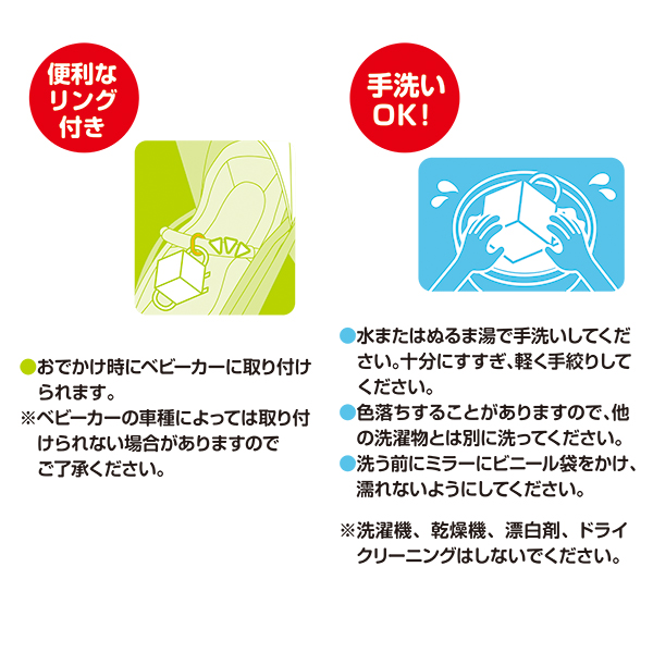 取っ手とお出かけ用のリングが付いているので、ベビーベッドやベビーカー等に付けられて、おうちでもお外でも遊べます。