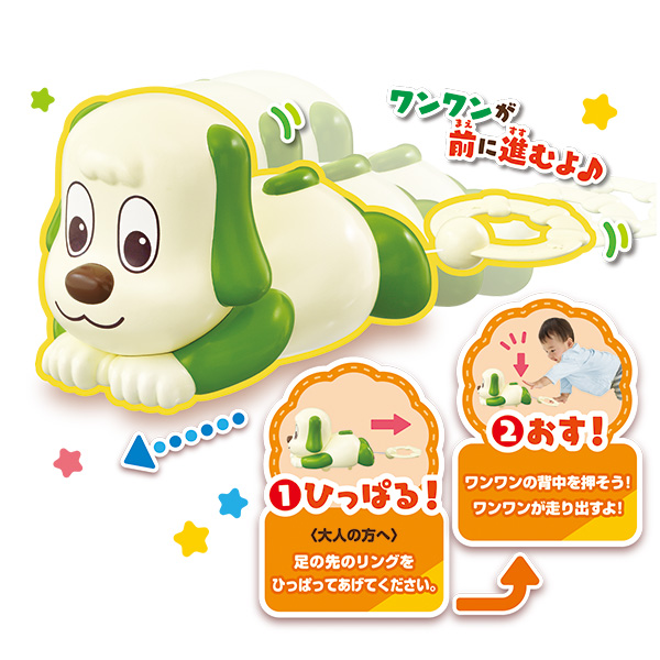 『ワンワン』の足の先のリングを引っ張り、背中を押すと、『ワンワン』が前に進みます。