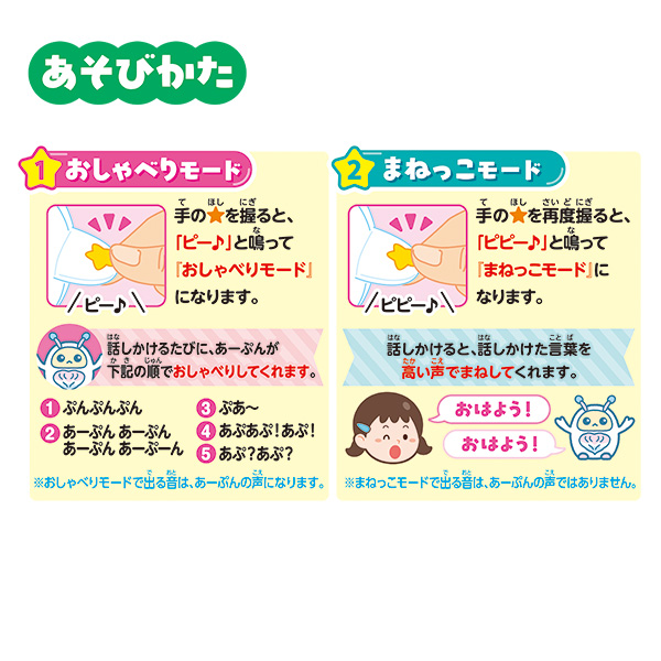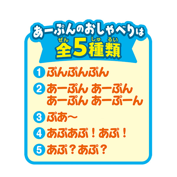 話しかけるたびに、あーぷんが「ぷあ~」など5種類のおしゃべりを順番に返してくれます。