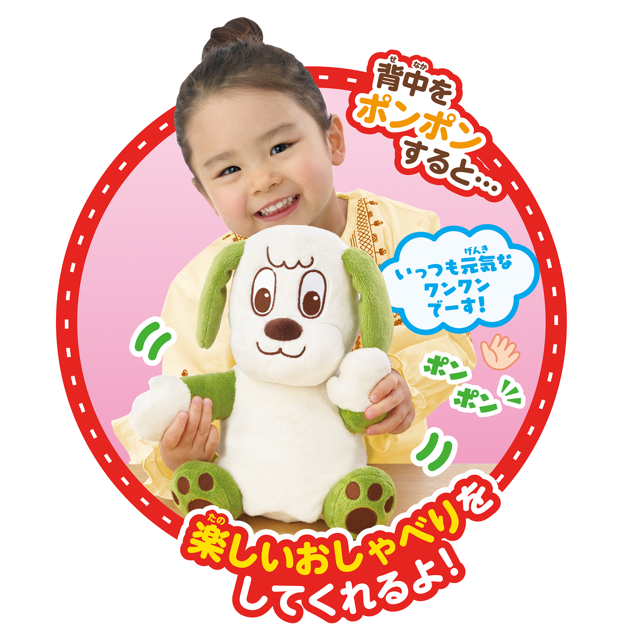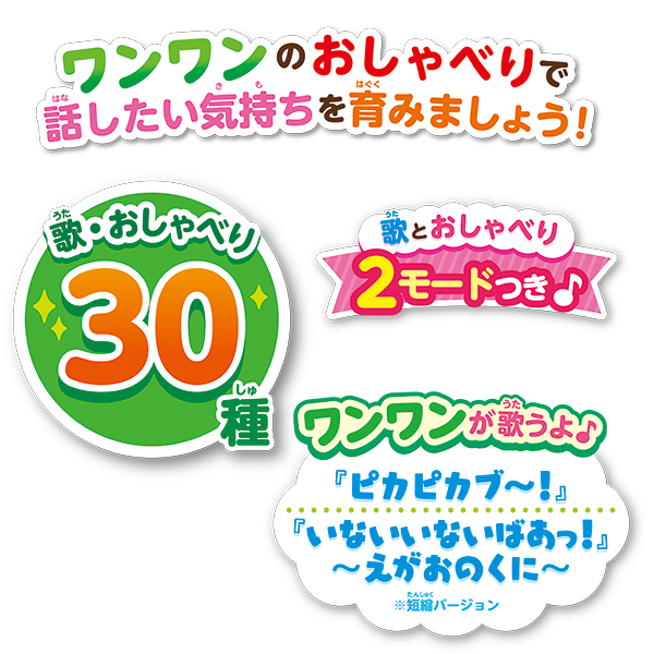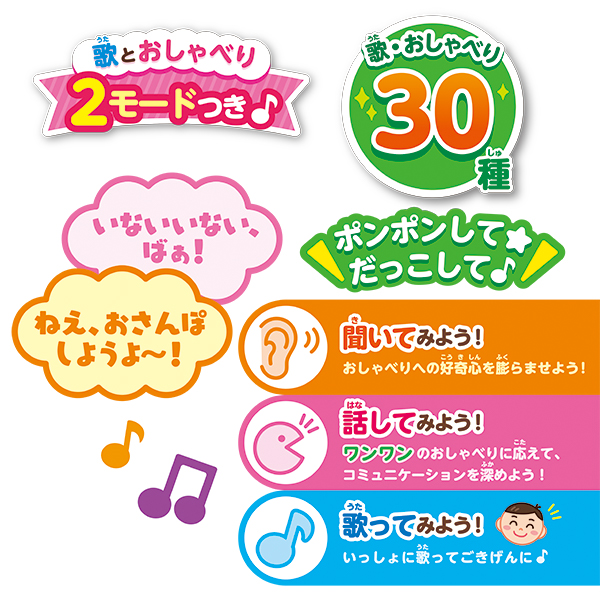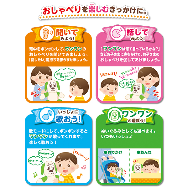 背中をポンポンするたびに、『ワンワン』が話しかけてくれたり鼻歌をうたってくれるコミュニケーションを育むぬいぐるみです。1才半くらいになると言葉やおしゃべりに興味を持つお子様が増えるので、そんなお子様の「話したい気持ち」をぬいぐるみを使って促しコミュニケーションを育みましょう!