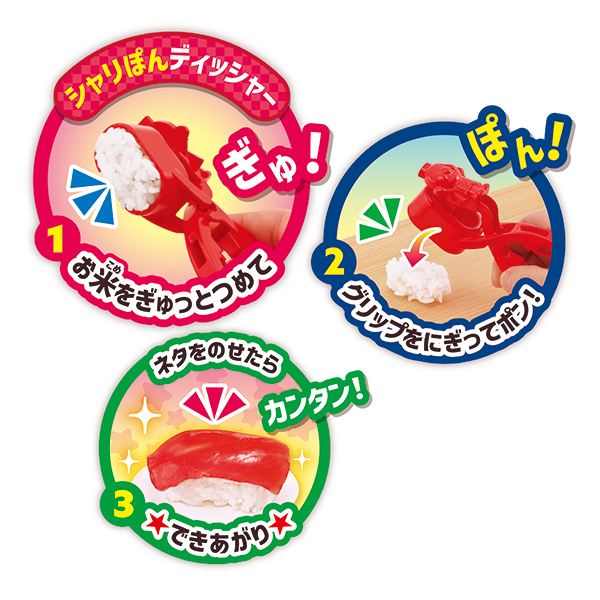 本物のおすしをのせて、おうちで回転ずしを楽しめる商品です。シャリぽんディッシャーにごはんを詰めてグリップを握るだけ!お子様でも簡単にシャリを作ることができます。