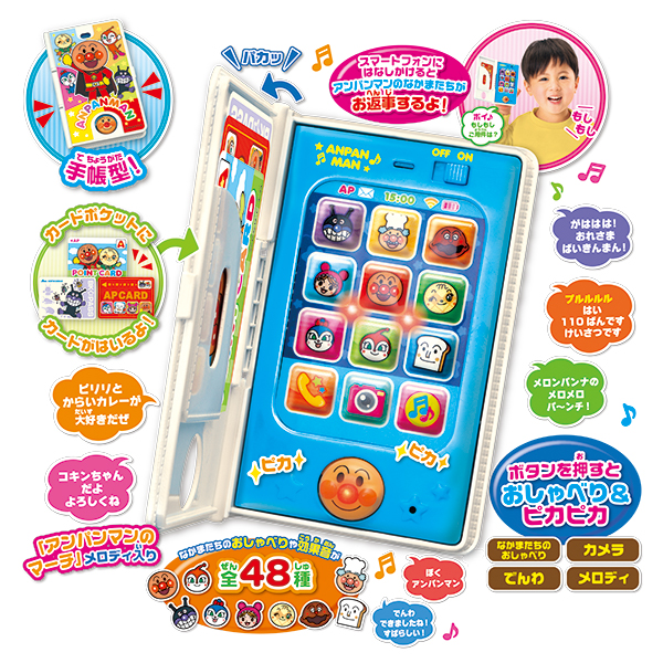 12個のぷくっとしたボタンを押すと、アンパンマンのなかまたちのおしゃべりや電話のおしゃべり、カメラの音、アンパンマンのマーチのメロディが流れます。