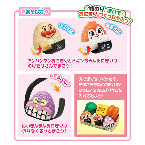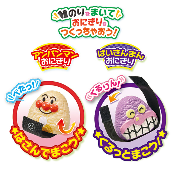 アンパンマンおにぎりと、ドキンちゃんおにぎりは、のりをはさむようにして巻き、ばいきんまんおにぎりは、横をくるっとして巻こう!!