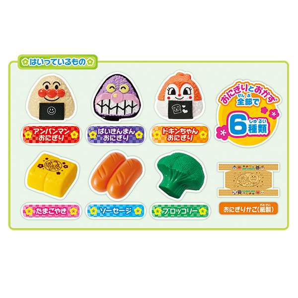 アンパンマンおにぎり、ばいきんまんおにぎり、ドキンちゃんおにぎり、たまごやき、ソーセージ、ブロッコリー、おにぎりかご(紙製)