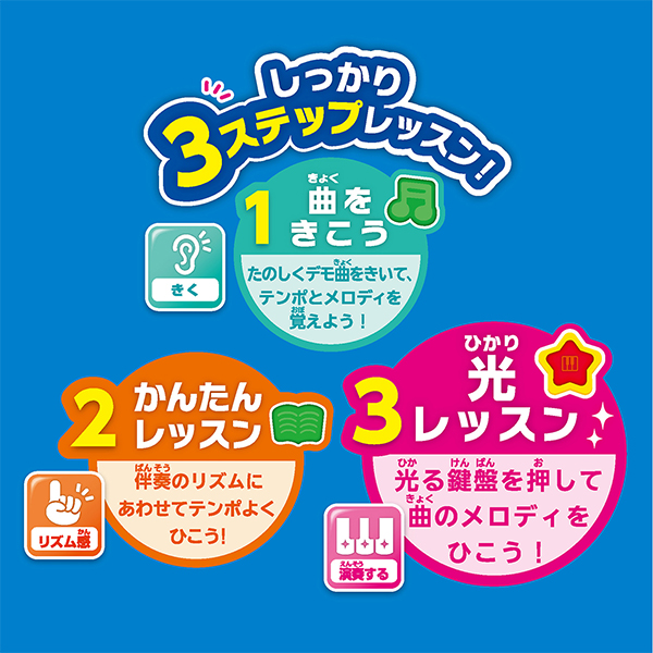 曲の通りに鍵盤が順番に光って音階を教えてくれるので、鍵盤の場所とタイミングを合わせて弾くことで曲を覚えることができます。