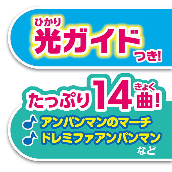 楽曲「アンパンマンのマーチ」を含む全部で14曲、8和音が出るピアノ・トランペット・バイオリン・ベルの音色に切り替えられるボタンや、動物や乗り物や打楽器などの24種類の擬音も入っています。
