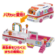 人形をのせて転がし遊びができる救急車、、、パカッとひらくと病院に変形します!
