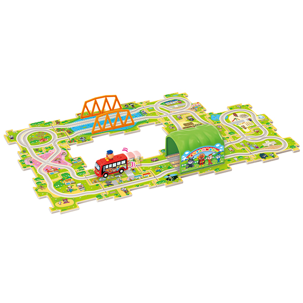 アンパンマンが乗ったJR四国のアンパンマン路線バスがパズルロードの上を電動でくねくね走ります。