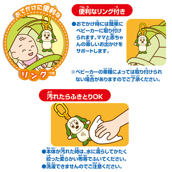 リングがついているので、ベビーカーに取り付けることができ、いつでもワンワンと一緒♪