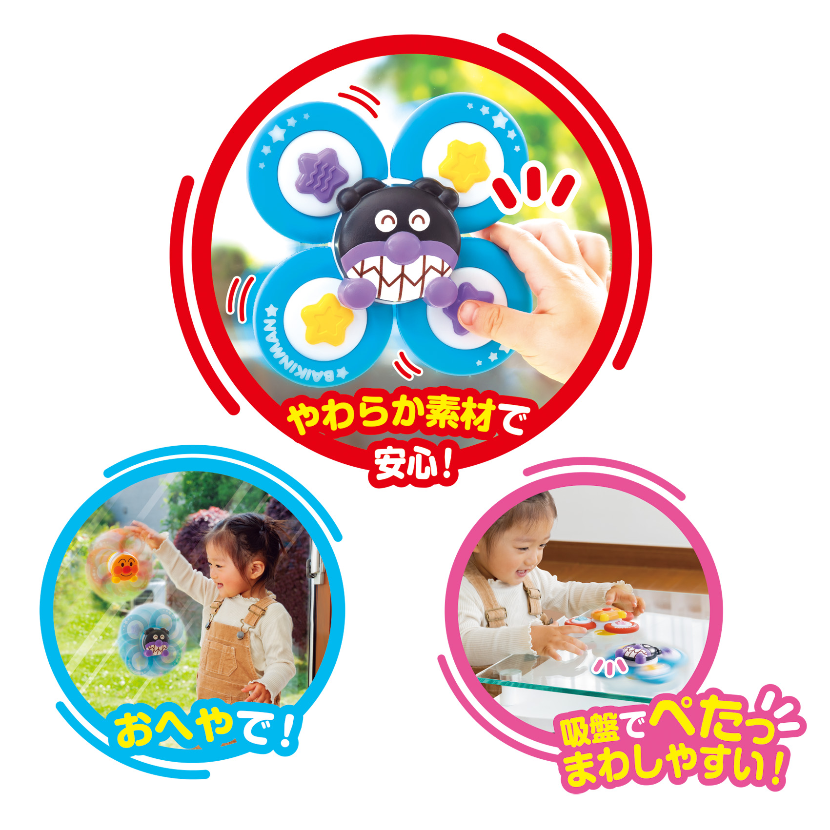 アンパンマンは3枚はね、ばいきんまんは4枚はねのスピナーで、回転の違いを楽しめます。