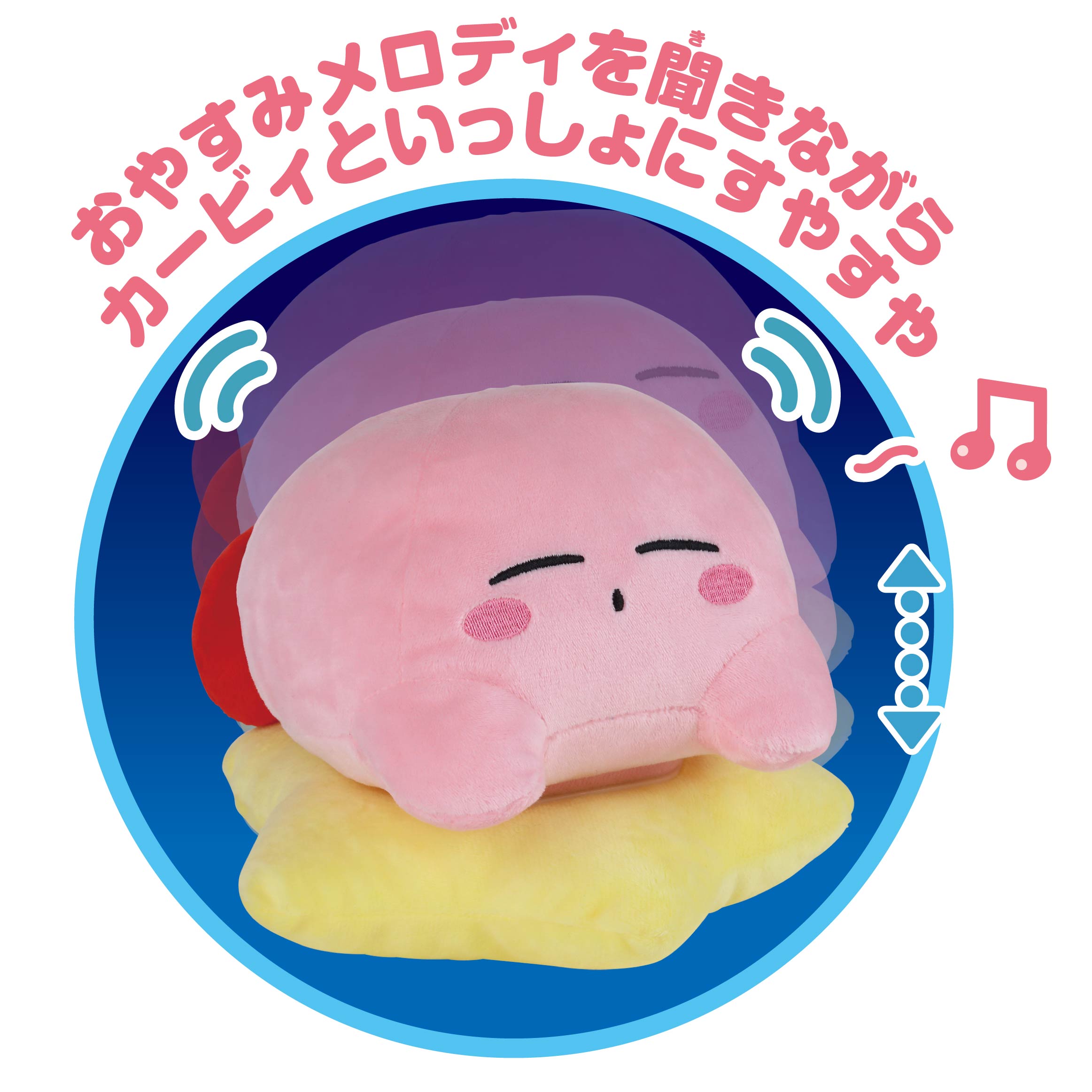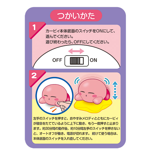 左手にあるスイッチを押すと、オリジナルのおやすみメロディと共にカービィが寝息をたてているように動きます。