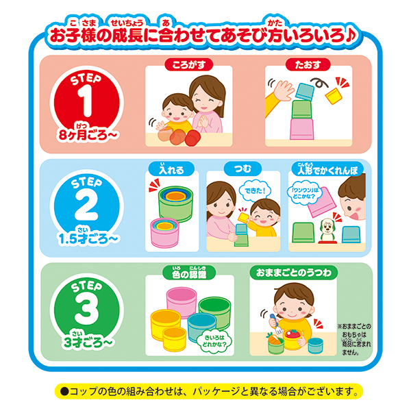 転がしたり倒したりが楽しい8ヶ月頃~色の認識ができたり器にしておままごとをするなどができる3才頃までお子様の成長に合わせて遊び方が色々♪